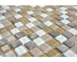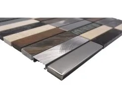 Dit mozaïek heeft een modern effect, het oppervlak is geborsteld en de uitstraling is verfijnd. Dit is een blikvanger zowel in het licht als in de schaduw.